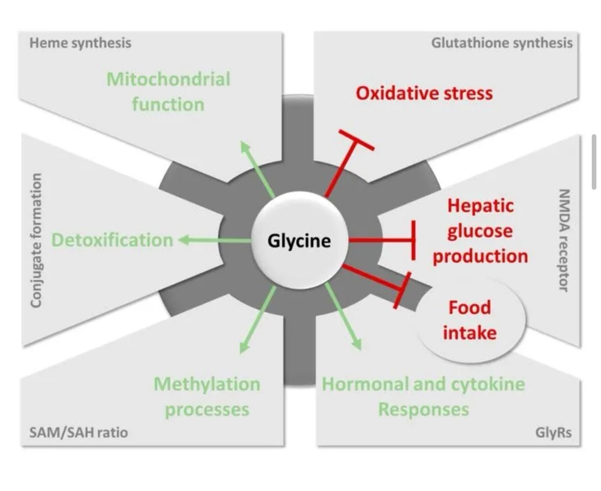 glucose production and regulating food level intake (surprising link between low glycine levels and obesity/diabetes)