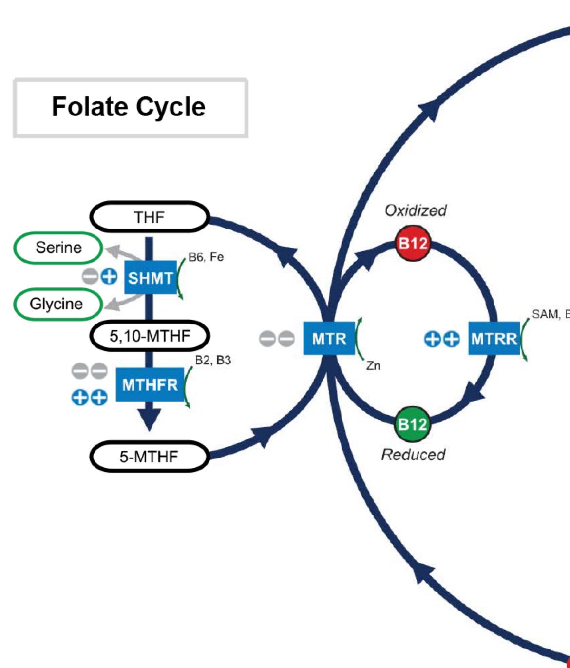 To review methylation briefly, you might recall that MTHFR stands for methylene tetrahydrofolate reductase. What MTHFR does is to convert 5,10 methylenetetrahydrofolate into 5,10, methyltetrahhydrofolate. The latter is the compound that donates its methyl group to vitamin b-12, which in turn donates it to SAH ( s-adenosyl homocysteine) and thus completes it’s transformation into SAMe. (s-adenosyl methionine) It is SAMe which in turn circulates in the blood donation its methyl group for so many functions such as neurotransmitter synthesis and dna replication.