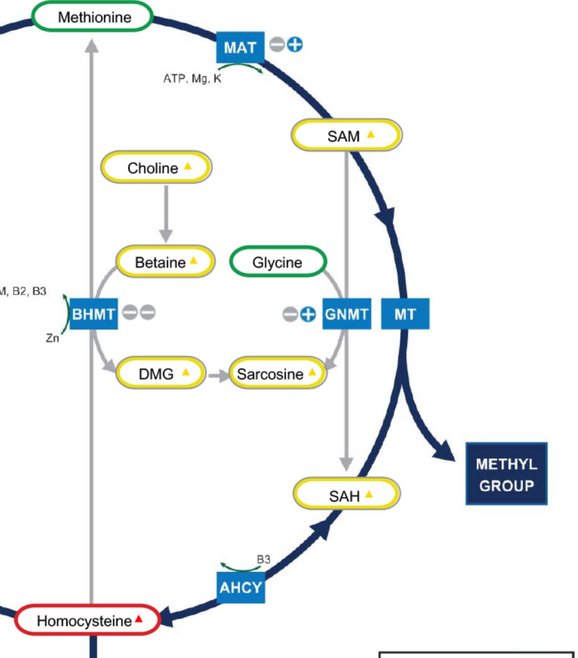 Take a minute to look at the graphic above. You can see ‘SAM’ in a yellow box on the upper right, which is another way of saying SAMe. The gray line shows it interacting with glycine, pictured in the green circle again. The end result is sarcosine (methylated glycine) and SAH which can be recycled by MTFHR back into SAMe. Now, you may also notice that the circle on the right continues to a blue box labeled MT, which stands for methyltransferases, of which there are at least 200, and the job of these enzymes is to transfer methyl groups to DNA and neurotransmitters or anywhere else they are needed. [sidebar-the greatest need for methylation is in pregnancy due to all the DNA replication required to grow the baby] When methyl groups are in excess of what is needed they are funneled to glycine, to be stored as sarcosine.