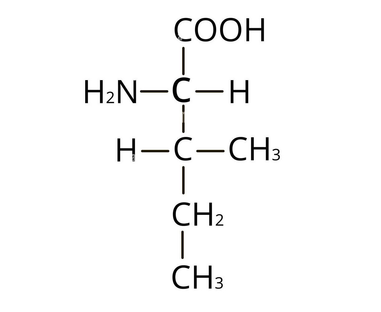 Now take a look at isoleucine (one of the BCAAs) by way of comparison. You can see the same basic features, the Carboxyl group attached to a carbon atom, the amine group (H2n) attached to the same carbon, the free hydrogen on the other side of the amine group, but then in the place of the single hydrogen side chain as in glycine, we see a side chain is much larger and more complex, consisting of a 4 carbon chain boasting two methyl groups (CH3) and one methylene group (CH2)